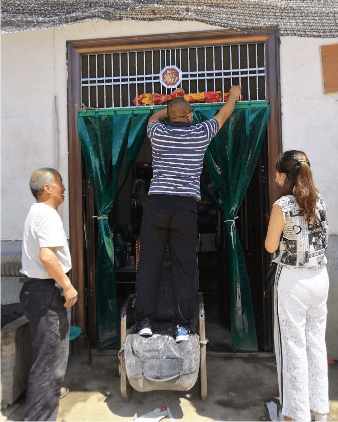 西安水建集團副總經(jīng)理吳振江為幫扶對象擦拭門上的灰土